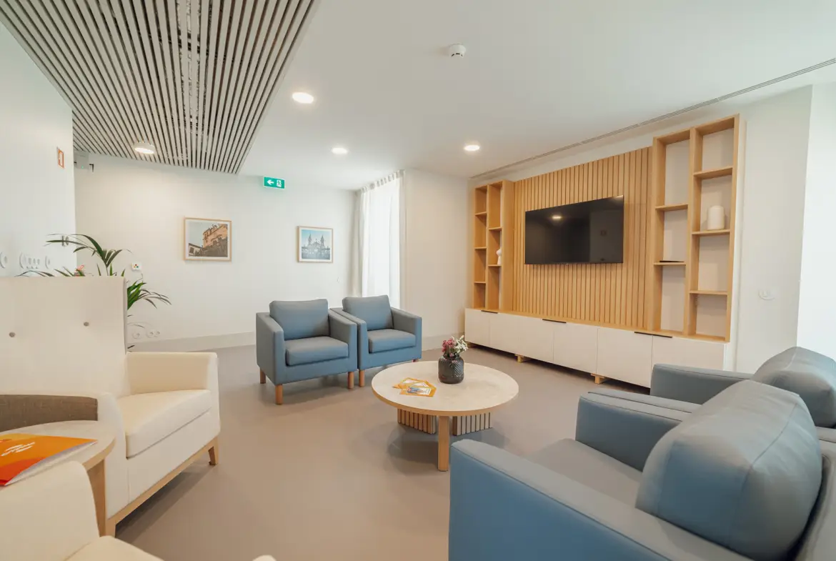 A estrutura foi concebida para acolher até 104 residentes, com quartos individuais e duplos cuidadosamente preparados para responder às diferentes necessidades e preferências. Cada espaço combina funcionalidade e bem-estar, incluindo climatização, sistemas de chamada de apoio e mobiliário adaptado. Os residentes podem ainda personalizar os quartos com objetos e peças próprias, reforçando o sentimento de pertença e tornando o ambiente verdadeiramente acolhedor. Todos os alojamentos dispõem de casas de banho privadas adaptadas, garantindo a segurança e a autonomia dos utilizadores, mesmo daqueles que necessitam de apoios técnicos adicionais.